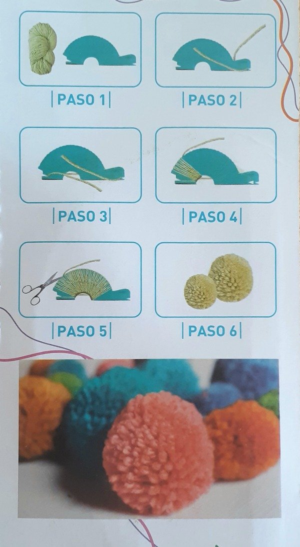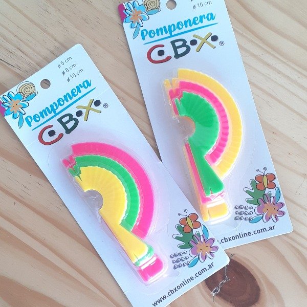 Pomponera plástica para fabricar pompones de tres tamaños diferentes.